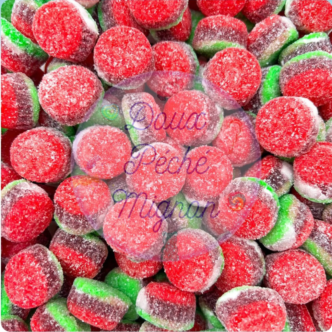 Sirop de glucose, sucre, eau, gélatine*, amidon modifié de pomme de terre, acidifiants E270, E330, agents d’enrobage huile végétale (Palme), E901 et E903, arôme artificiel, colorant, E129*, E133, E163, E100, E160a.